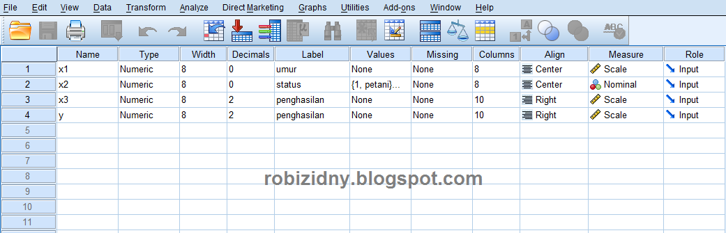 Khusus untuk variabel x2 (Status) : kolom Values diisi dengan ketentuan : 1 = petani; 2 = pegawai; 3 = swasta.